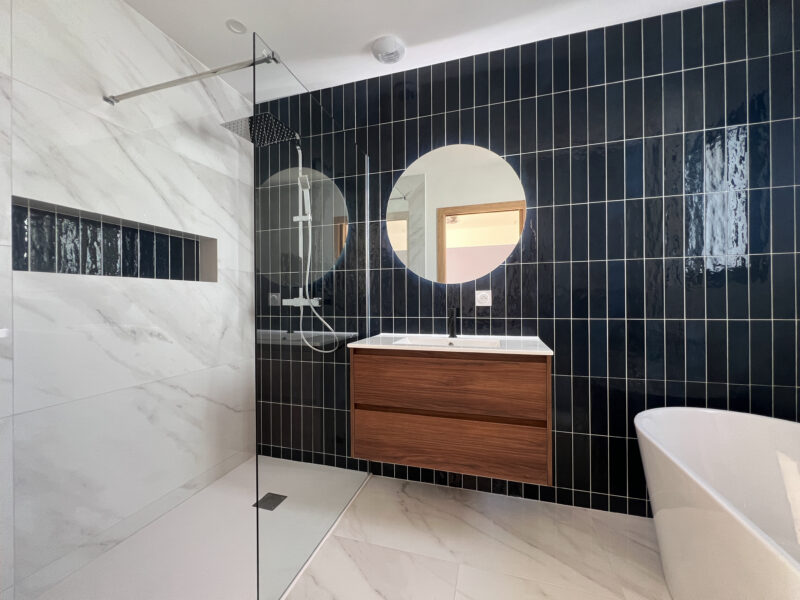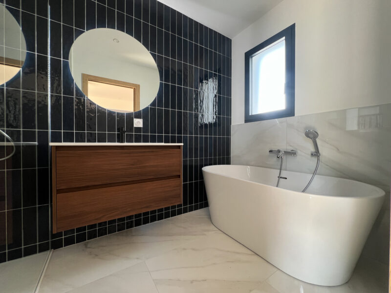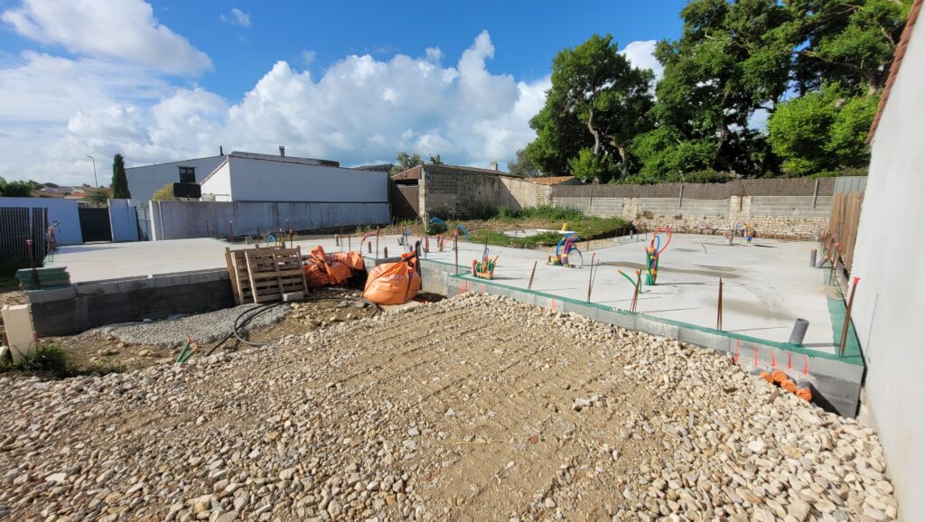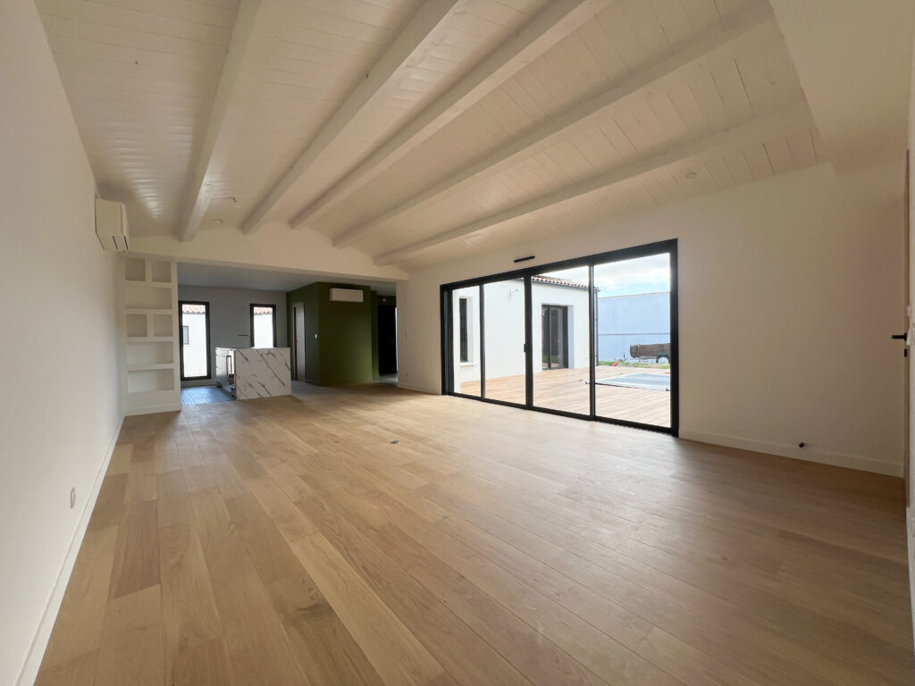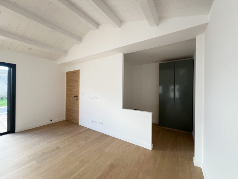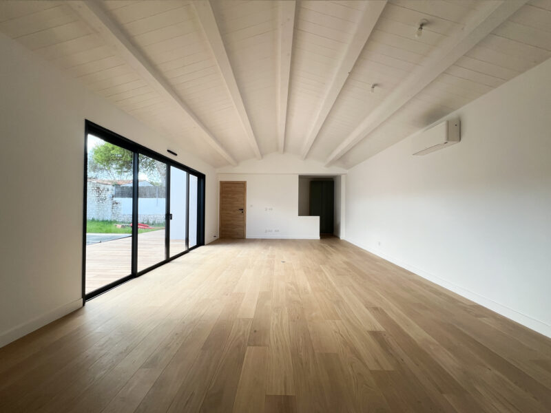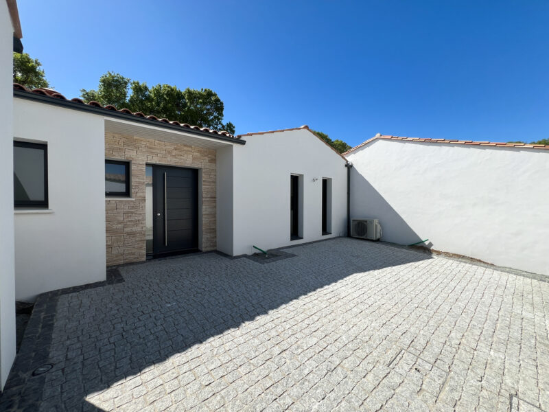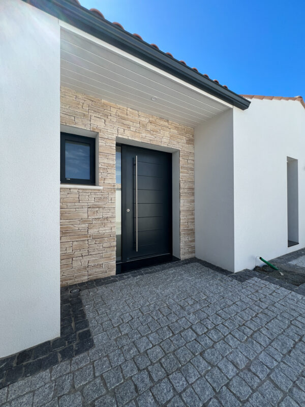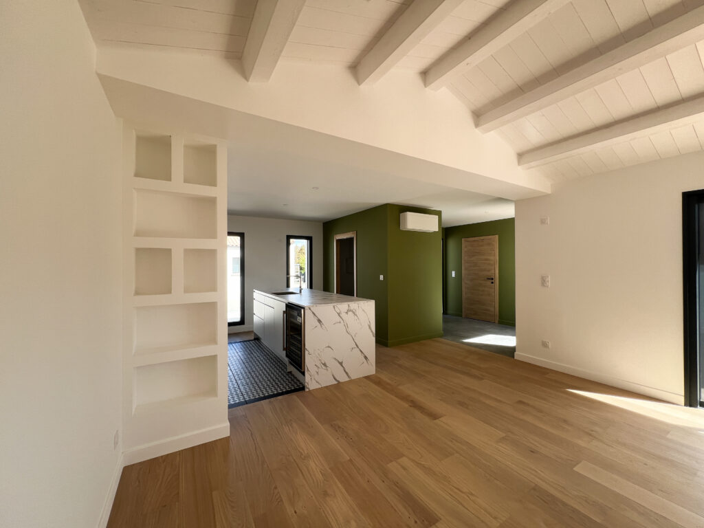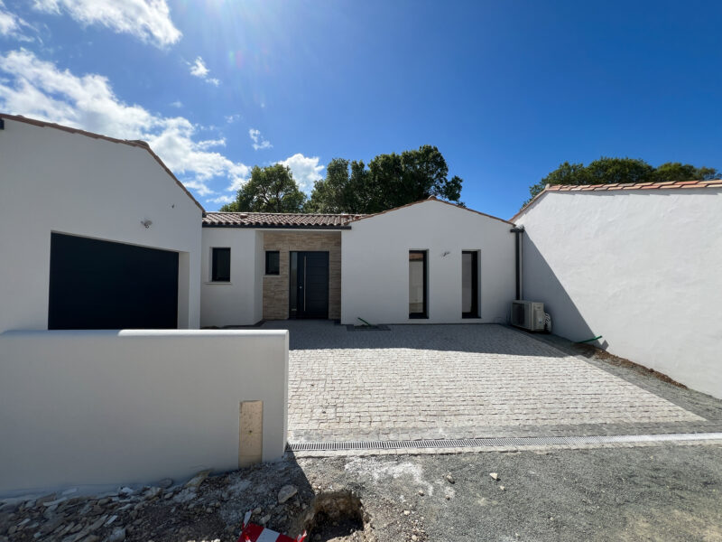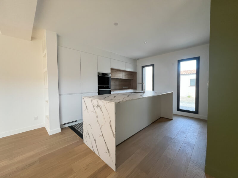 Voici un exemple de maison réalisée par les équipes de HELLO MAISON : une habitation de 120 m² habitables avec un garage de 30 m², située sur un terrain de 400 m² à Nieul-sur-Mer. La cuisine est semi-ouverte sur le salon-séjour orienté Sud, offrant une vue sur la piscine. La pièce principale dispose d’une charpente traditionnelle avec lambris en bois, et comprend deux suites avec salle de bains et dressing, équipées de robinetterie haut de gamme, d’une baignoire îlot et d’une douche italienne.