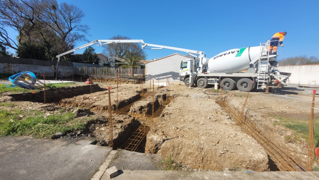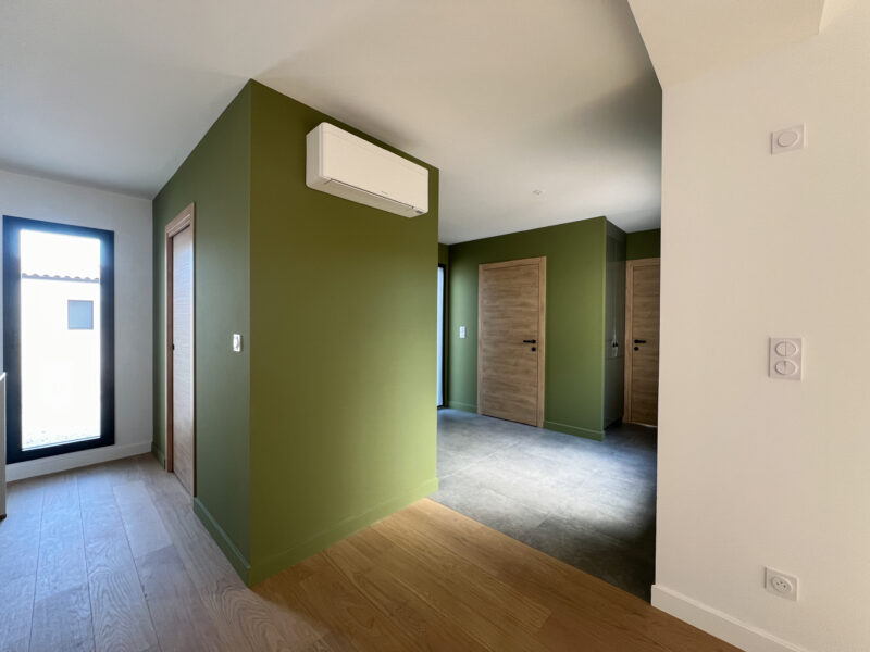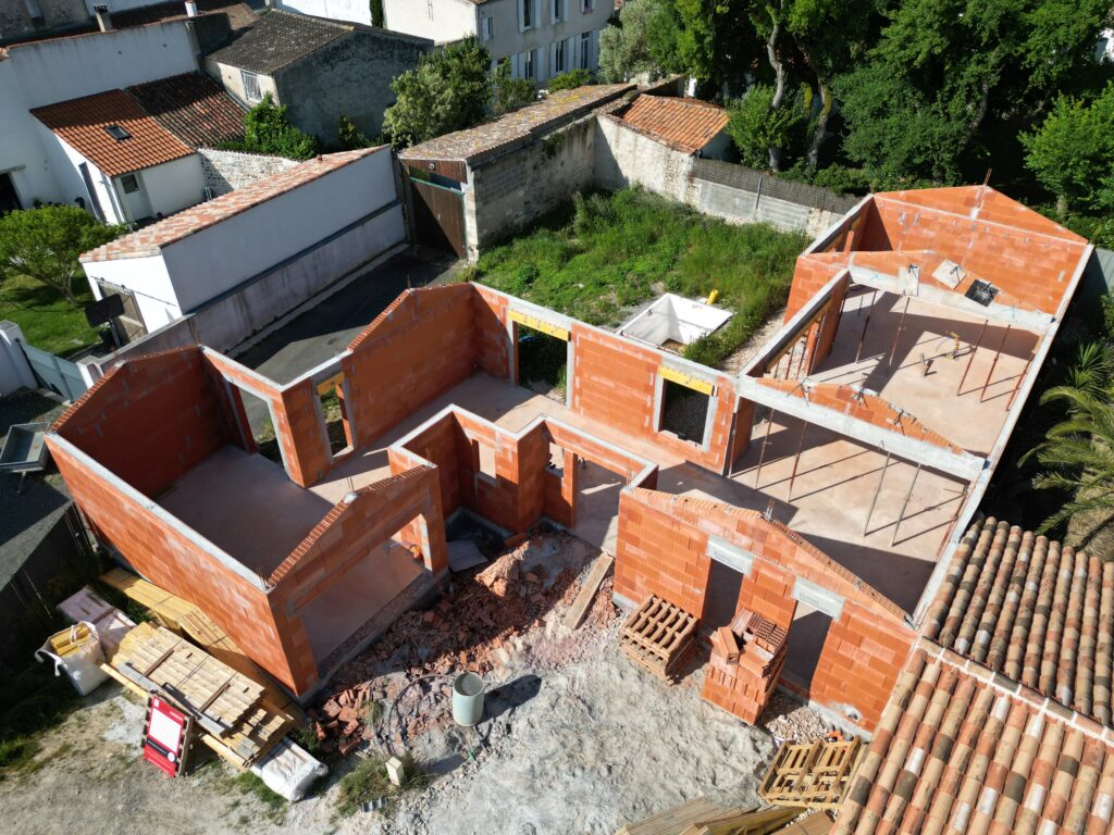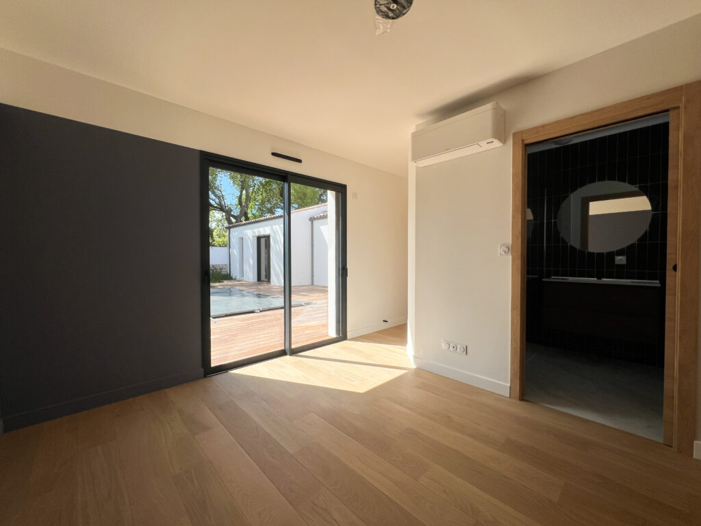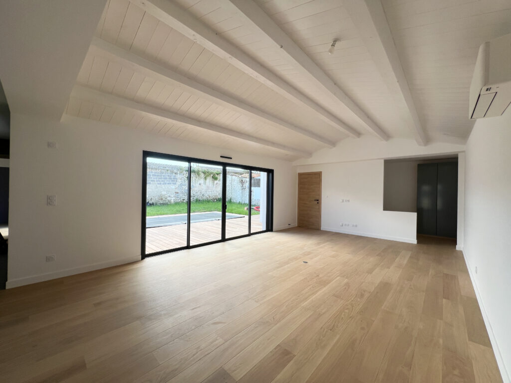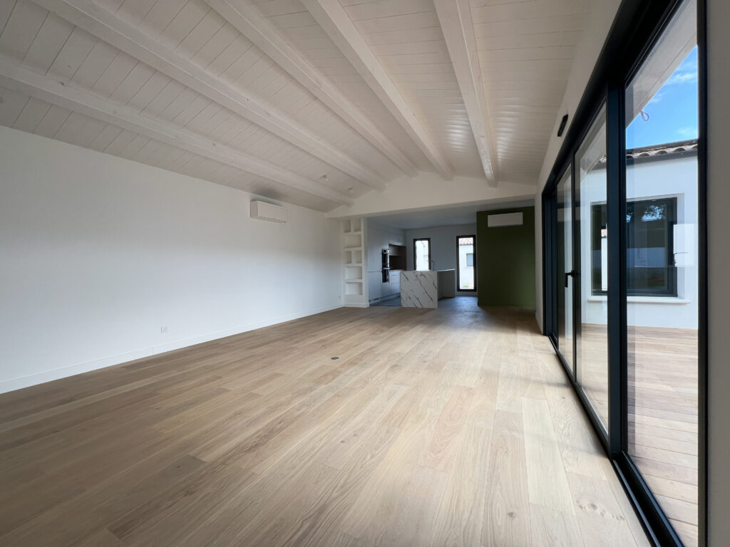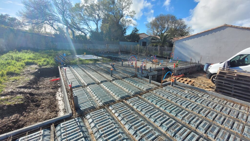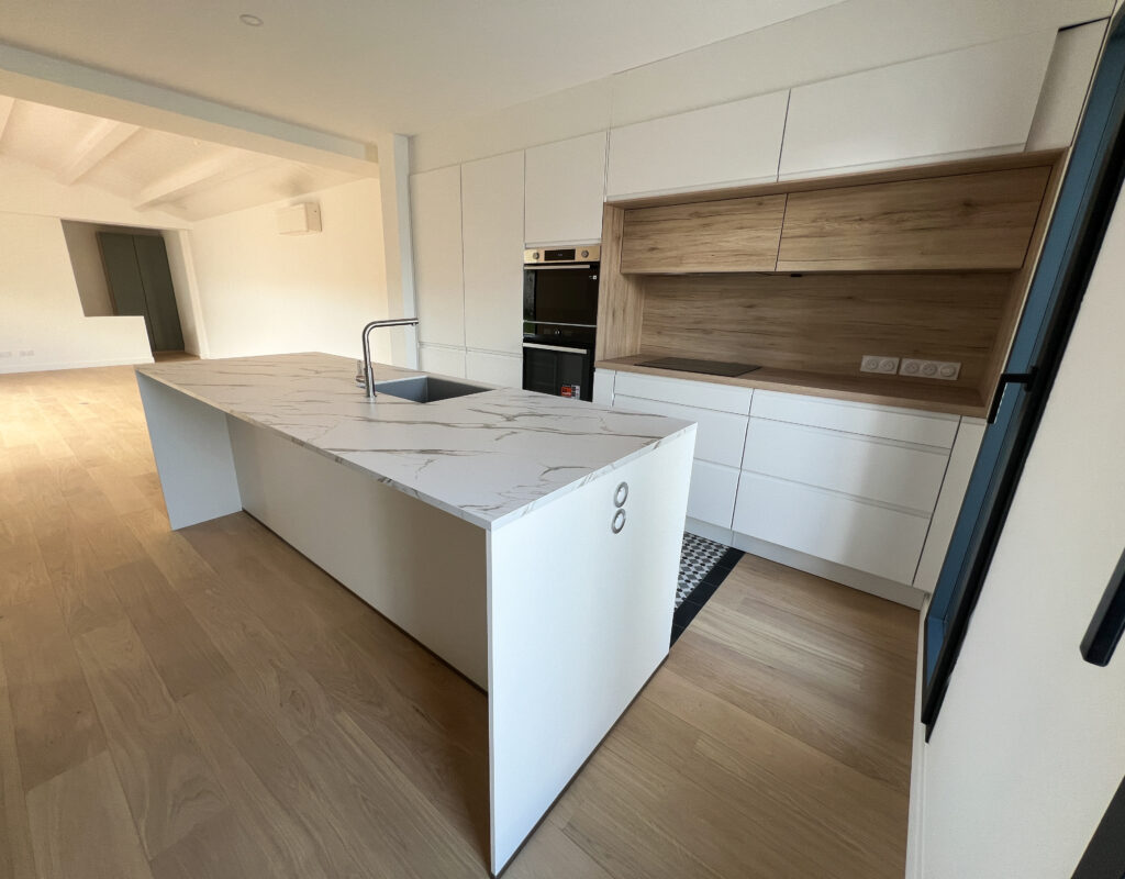 Voici un exemple de maison réalisée par les équipes de HELLO MAISON : une habitation de 120 m² habitables avec un garage de 30 m², située sur un terrain de 400 m² à Nieul-sur-Mer. La cuisine est semi-ouverte sur le salon-séjour orienté Sud, offrant une vue sur la piscine. La pièce principale dispose d’une charpente traditionnelle avec lambris en bois, et comprend deux suites avec salle de bains et dressing, équipées de robinetterie haut de gamme, d’une baignoire îlot et d’une douche italienne.