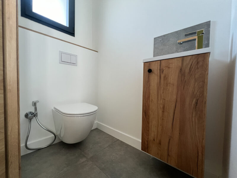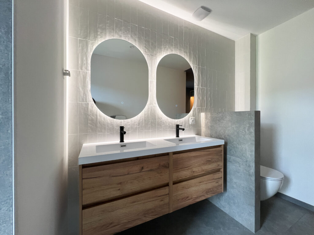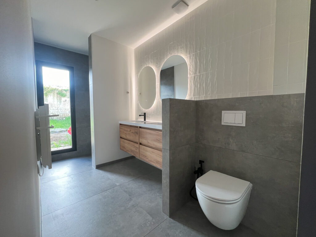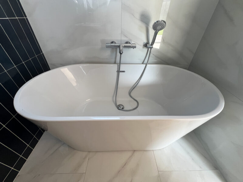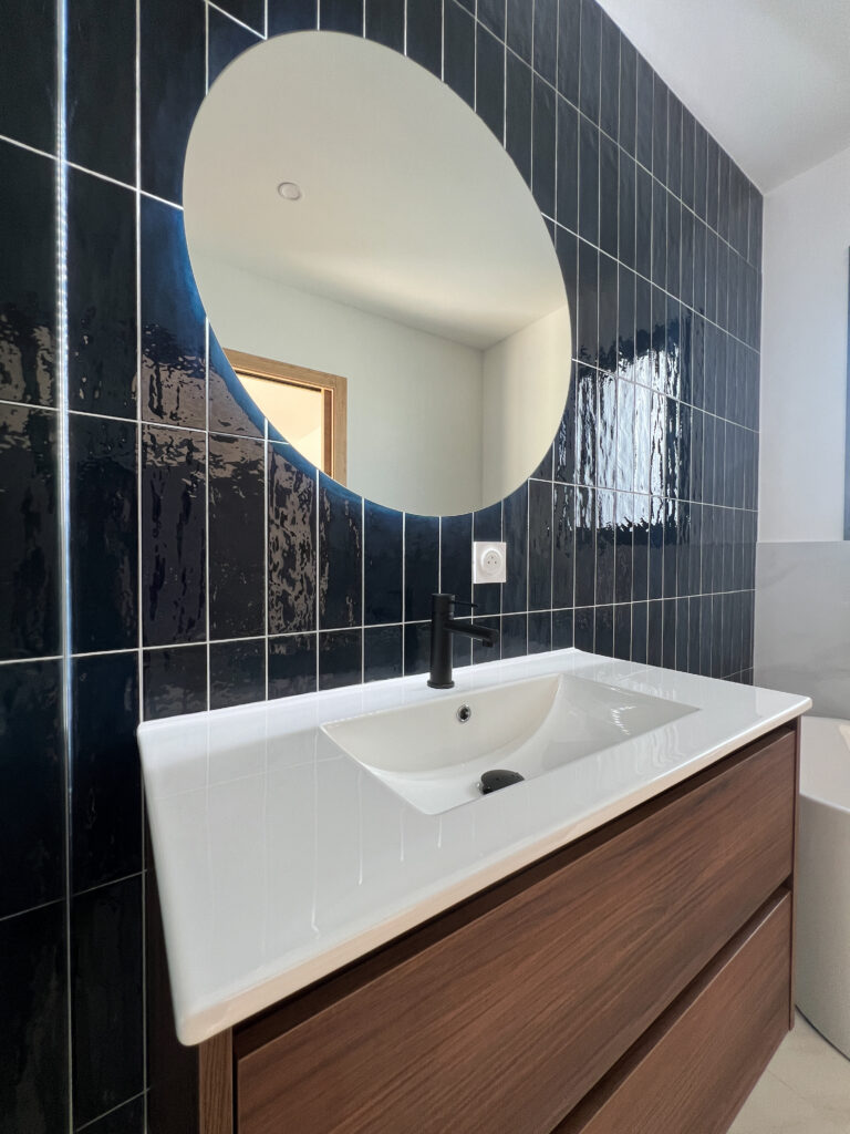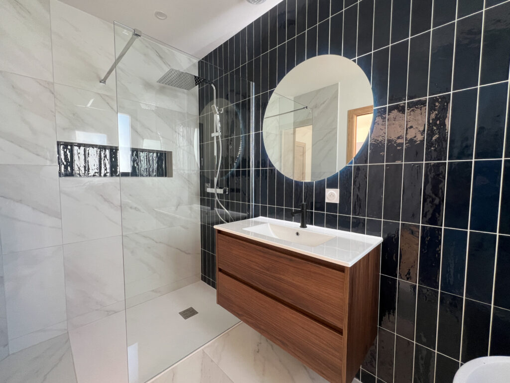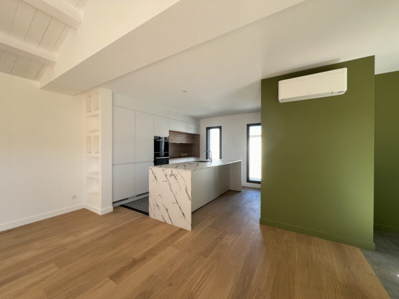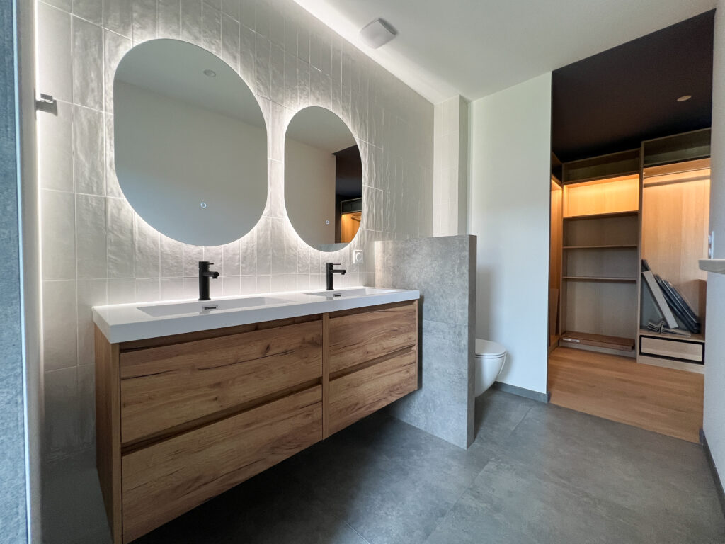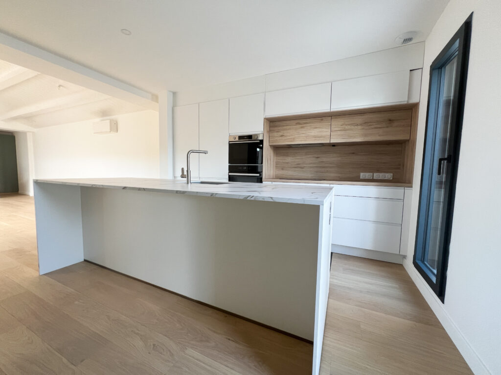 Voici un exemple de maison réalisée par les équipes de HELLO MAISON : une habitation de 120 m² habitables avec un garage de 30 m², située sur un terrain de 400 m² à Nieul-sur-Mer. La cuisine est semi-ouverte sur le salon-séjour orienté Sud, offrant une vue sur la piscine. La pièce principale dispose d’une charpente traditionnelle avec lambris en bois, et comprend deux suites avec salle de bains et dressing, équipées de robinetterie haut de gamme, d’une baignoire îlot et d’une douche italienne.