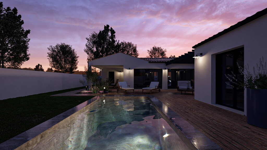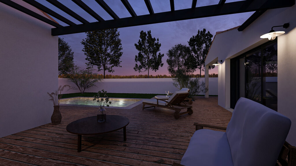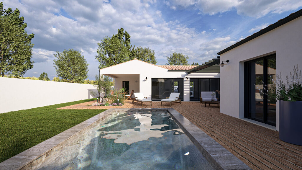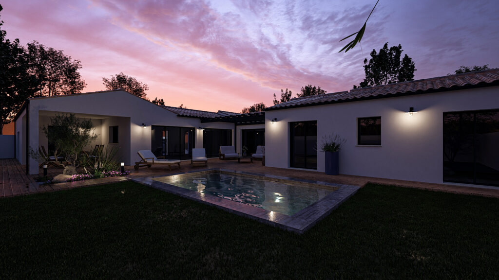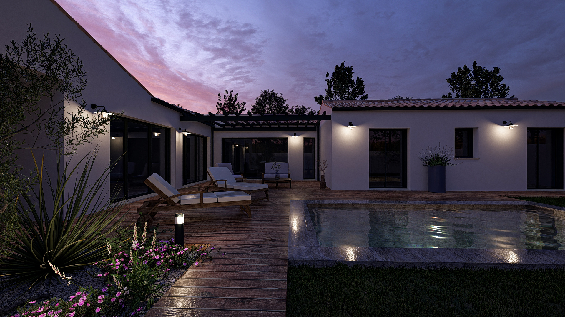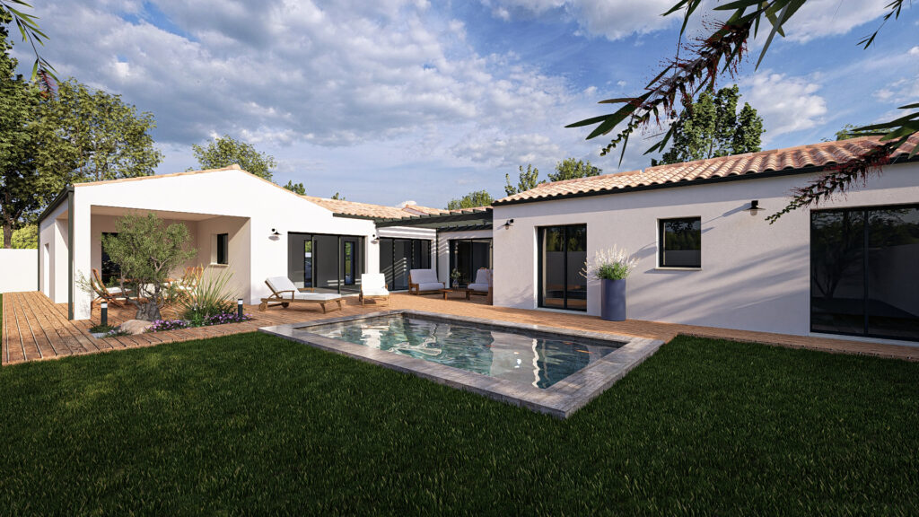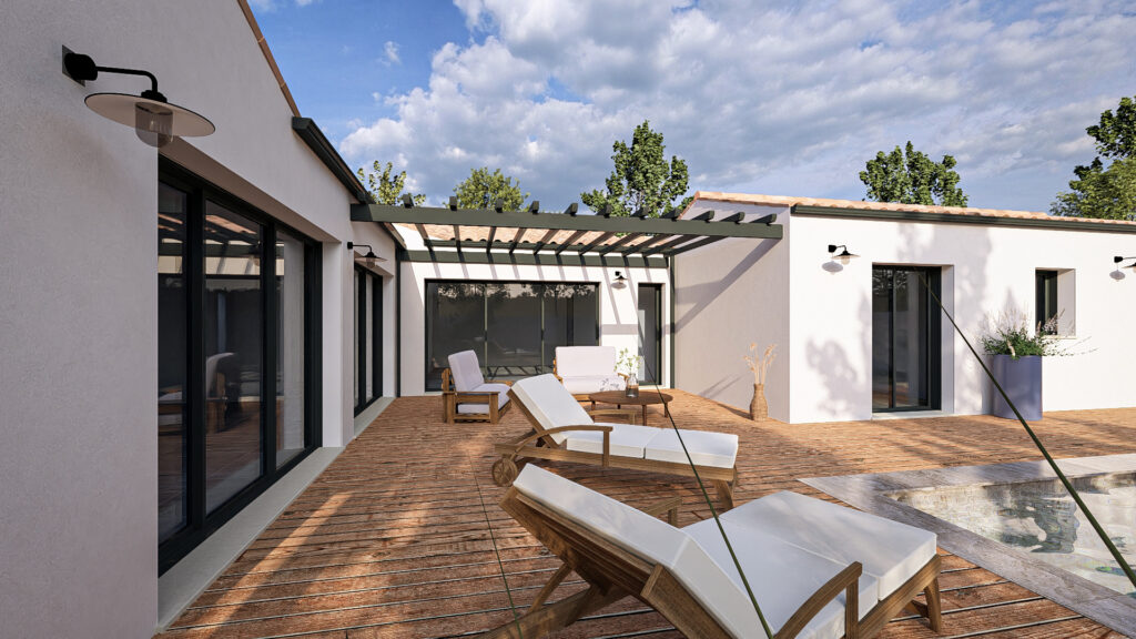 Maison de 130 m² habitables, composée de 4 chambres, dont une suite parentale avec dressing et salle d’eau. Elle dispose d’une cuisine ouverte donnant sur la terrasse extérieure et sur le séjour. Le salon bénéficie d’une double exposition, côté patio et pergola. À l’extérieur, la maison est aménagée avec une piscine accessible depuis la terrasse et visible depuis le préau.