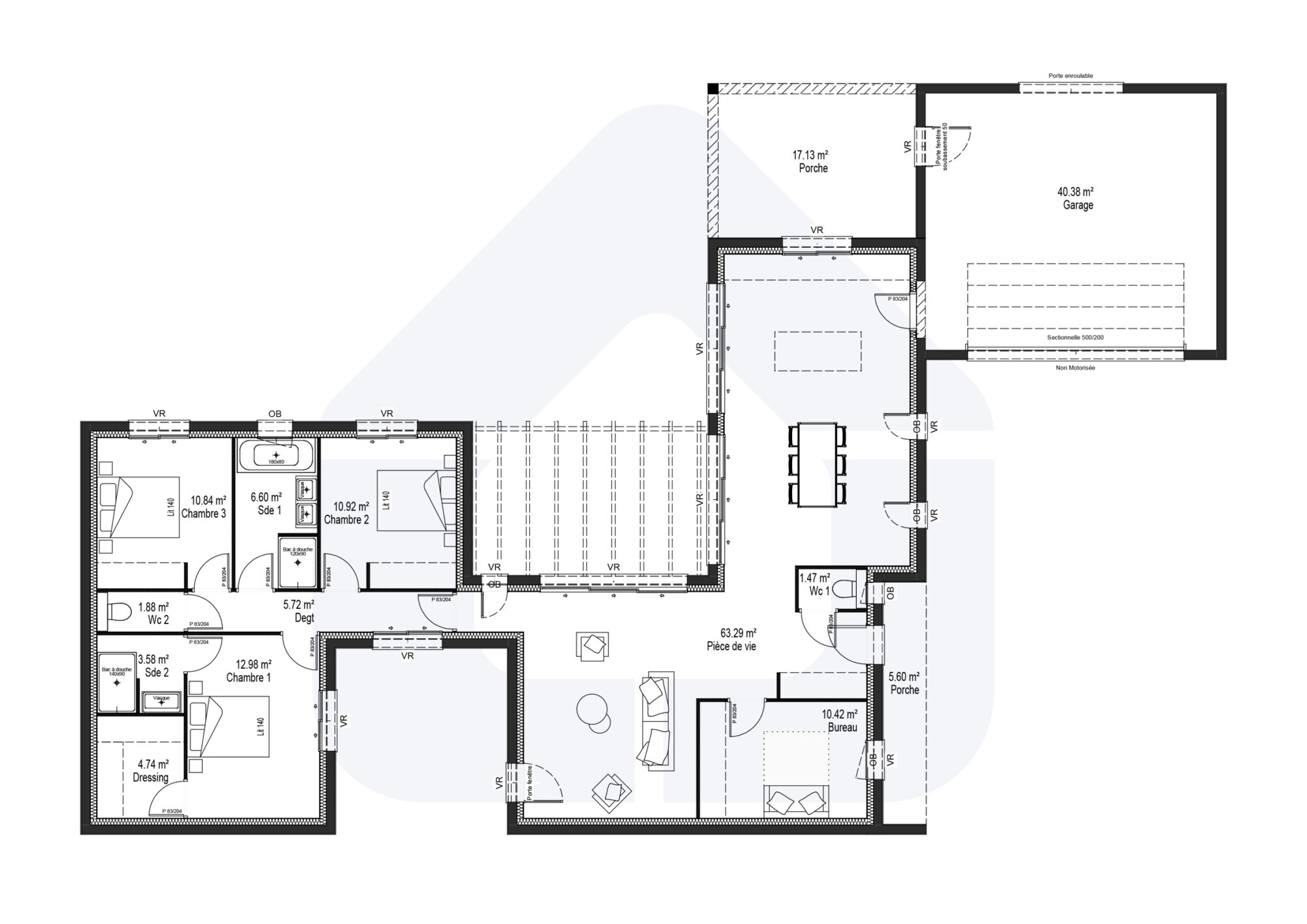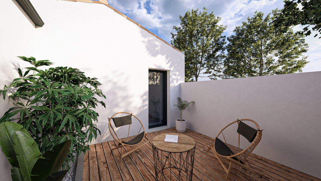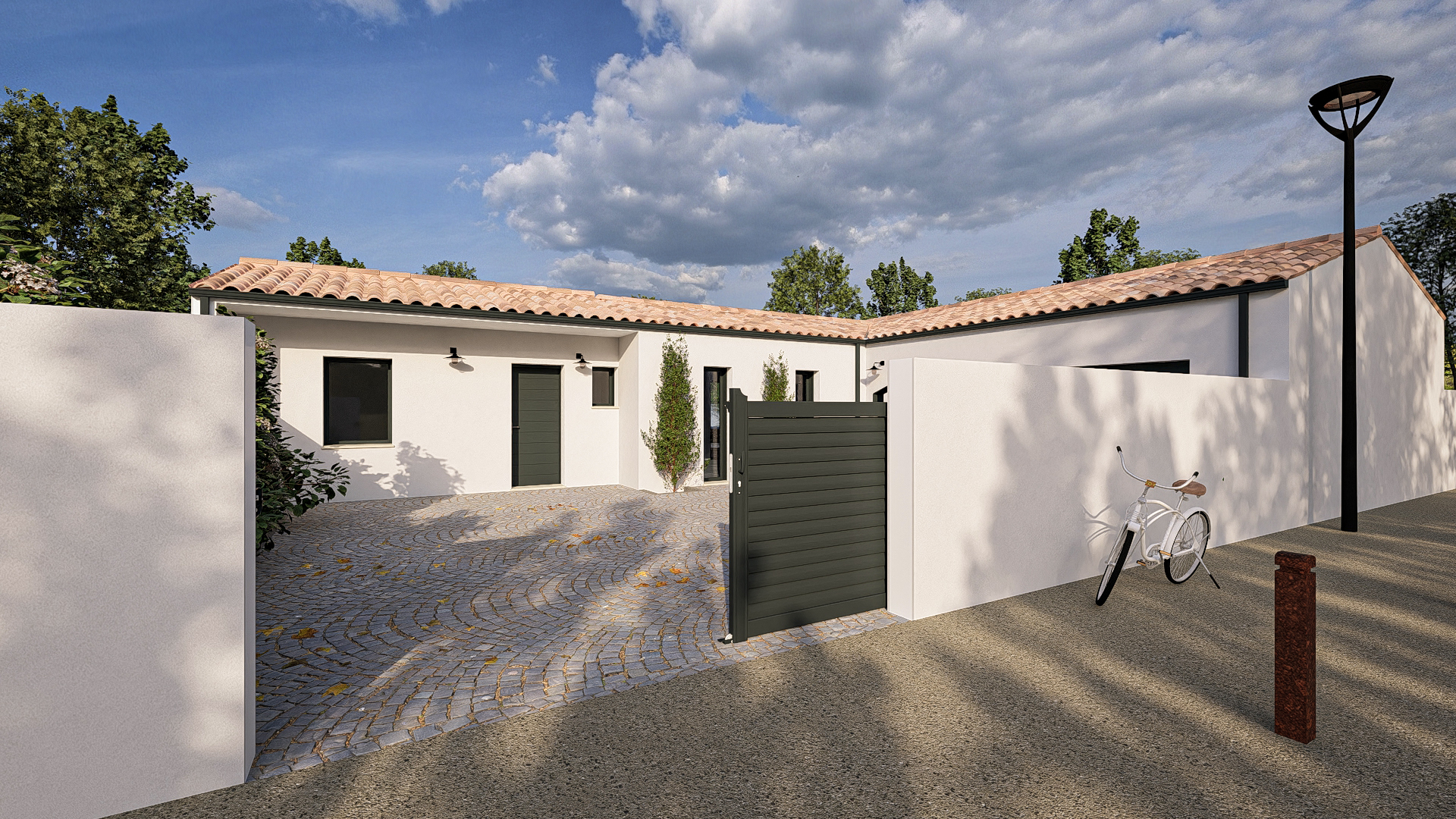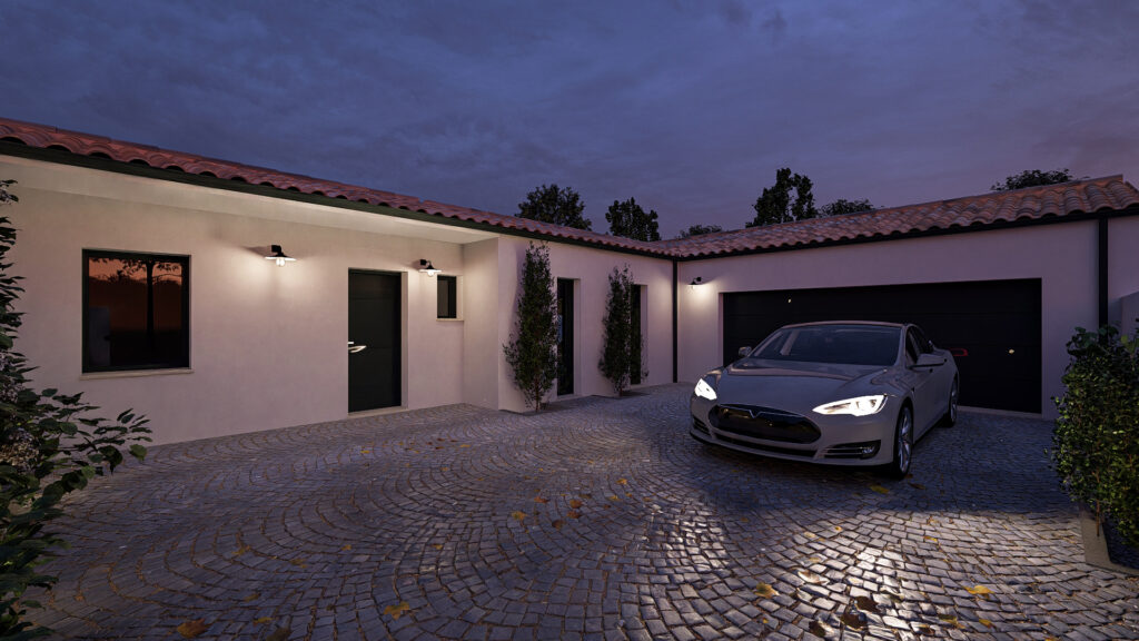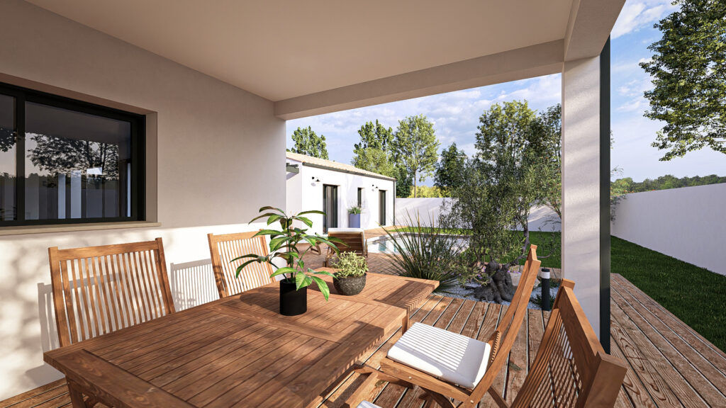 Maison de 130 m² habitables, composée de 4 chambres, dont une suite parentale avec dressing et salle d’eau. Elle dispose d’une cuisine ouverte donnant sur la terrasse extérieure et sur le séjour. Le salon bénéficie d’une double exposition, côté patio et pergola. À l’extérieur, la maison est aménagée avec une piscine accessible depuis la terrasse et visible depuis le préau.